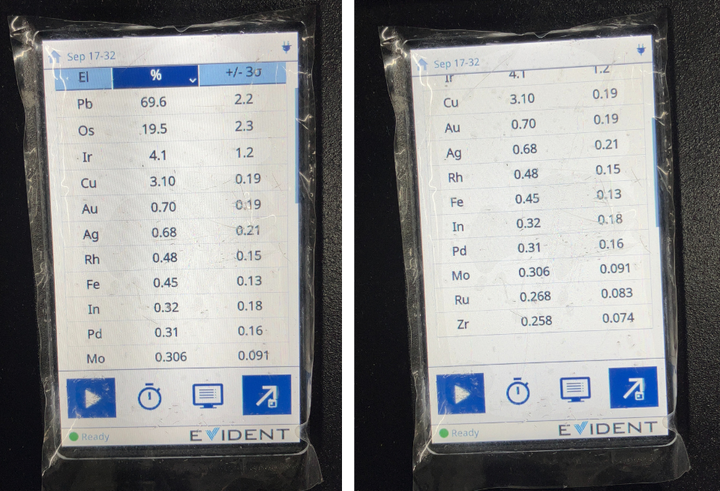 XRF分析は元素の特定エネルギーを読み取りますが、鉛の強いピークがOsやIrと重なることがあるため実際には存在しない成分が「ある」と表示されることがあるのです。